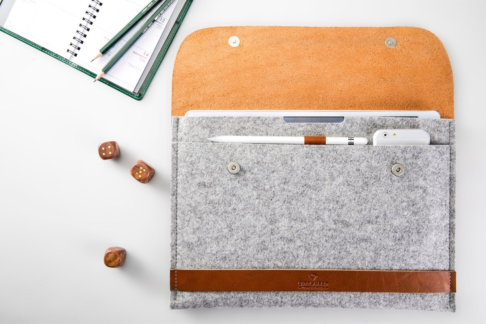 For your iPadPro you choose a CARRY MORE case made from natural merino wool felt and exceptional semi vegetable tanned leather. This is where you keep your iPad Pro, your smartphone, headphones and an Apple pencil.