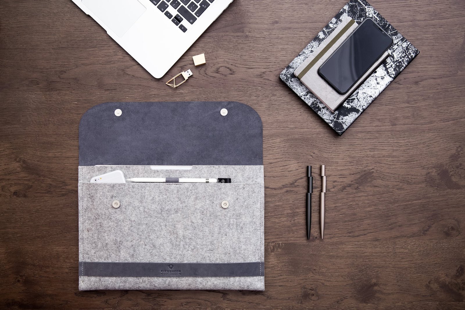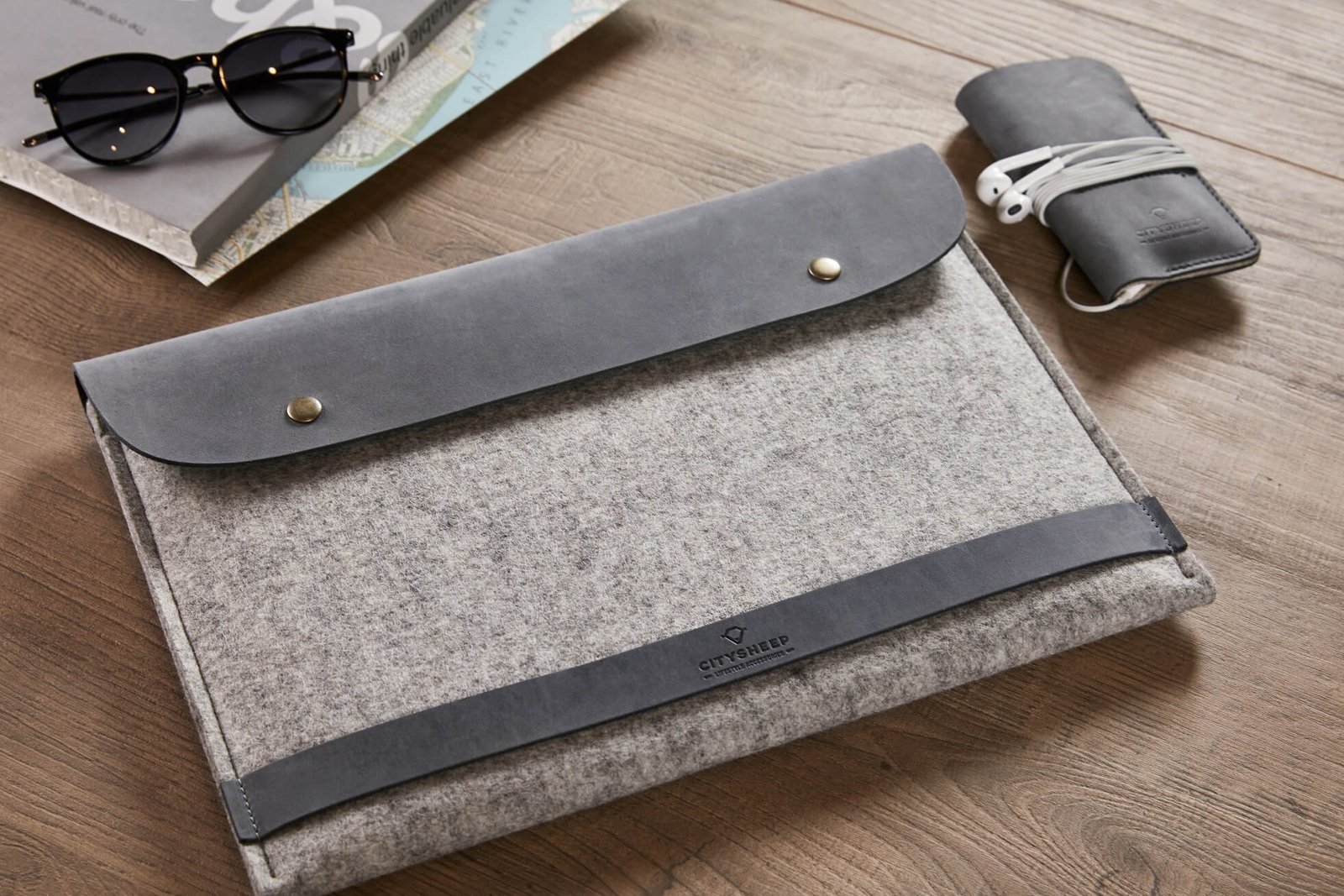 The CARRY MORE laptop case, made from natural merino wool felt and full grain Crazy Horse leather, will protect your computer from impacts, prevent scratches, and help you take it along to a long-awaited meeting. It’s also equipped with an additional compartment for your headphones, smartphone or a few loose bills.